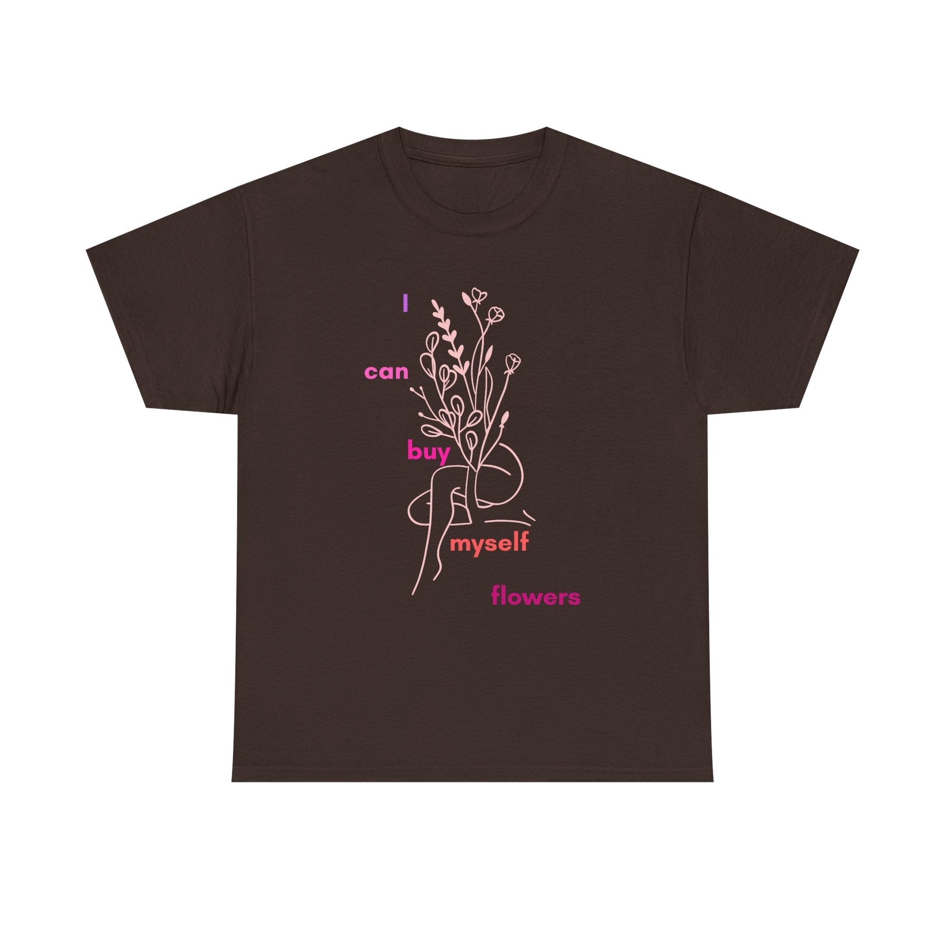 Soft, relaxed, and quietly confident — this classic crew tee carries a small, intimate message: “I can buy myself flowers.” A delicate line-drawn bouquet is printed in a whisper of pink, with the words artfully spaced down the front. The medium-weight cotton feels substantial yet breathable. Wear it on slow mornings with jeans, layer it under a cardigan for coffee shop afternoons, or pack it for weekend escapes when you want something that reads gentle and self-assured. The tear-away label keeps the neck itch-free, and reinforced shoulder tape maintains shape so the tee keeps feeling like an old favorite. Ethically grown cotton and clean manufacturing standards mean you can enjoy both comfort and conscience.