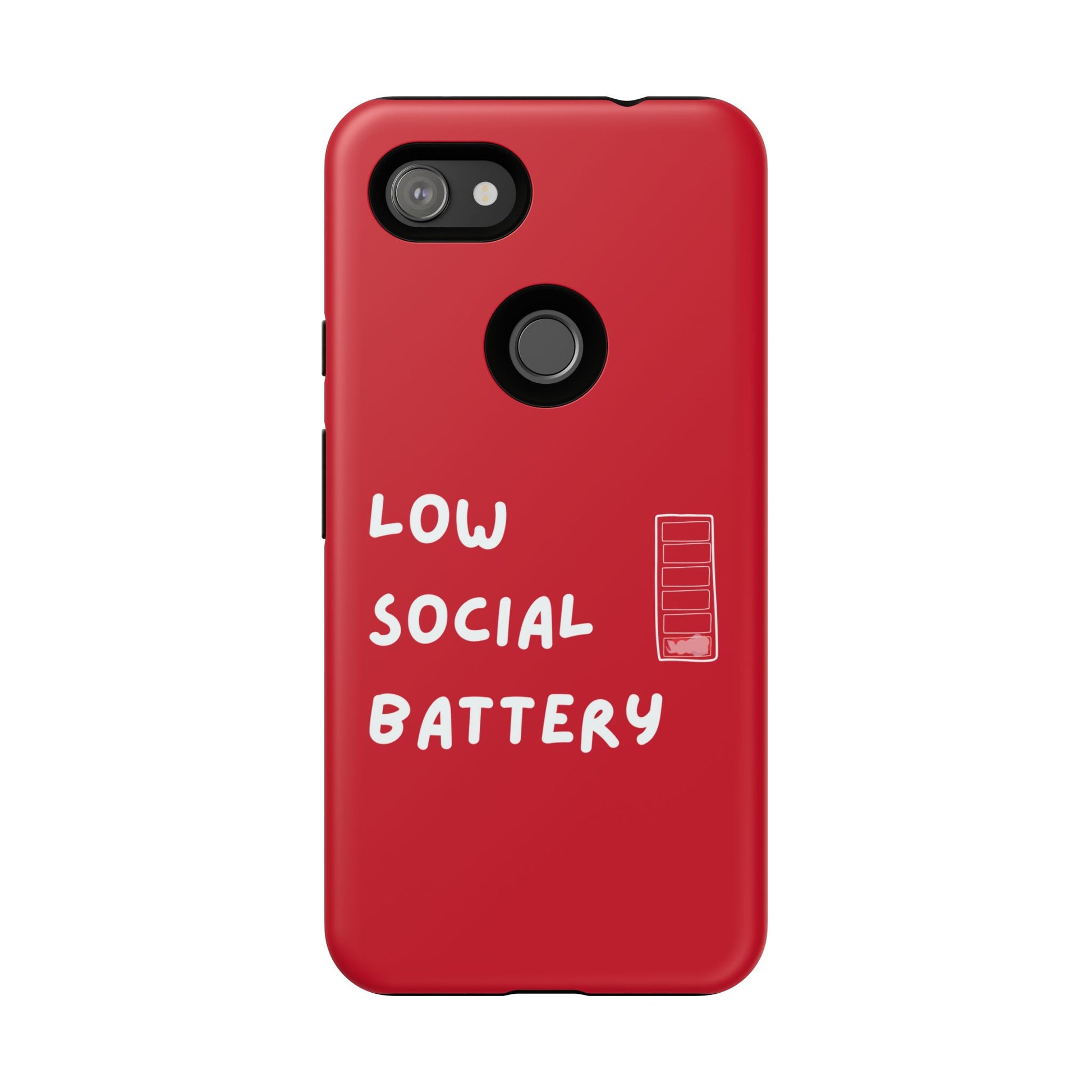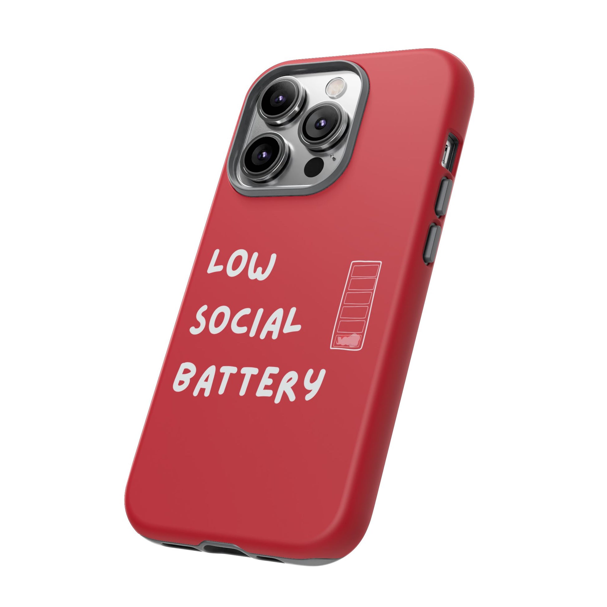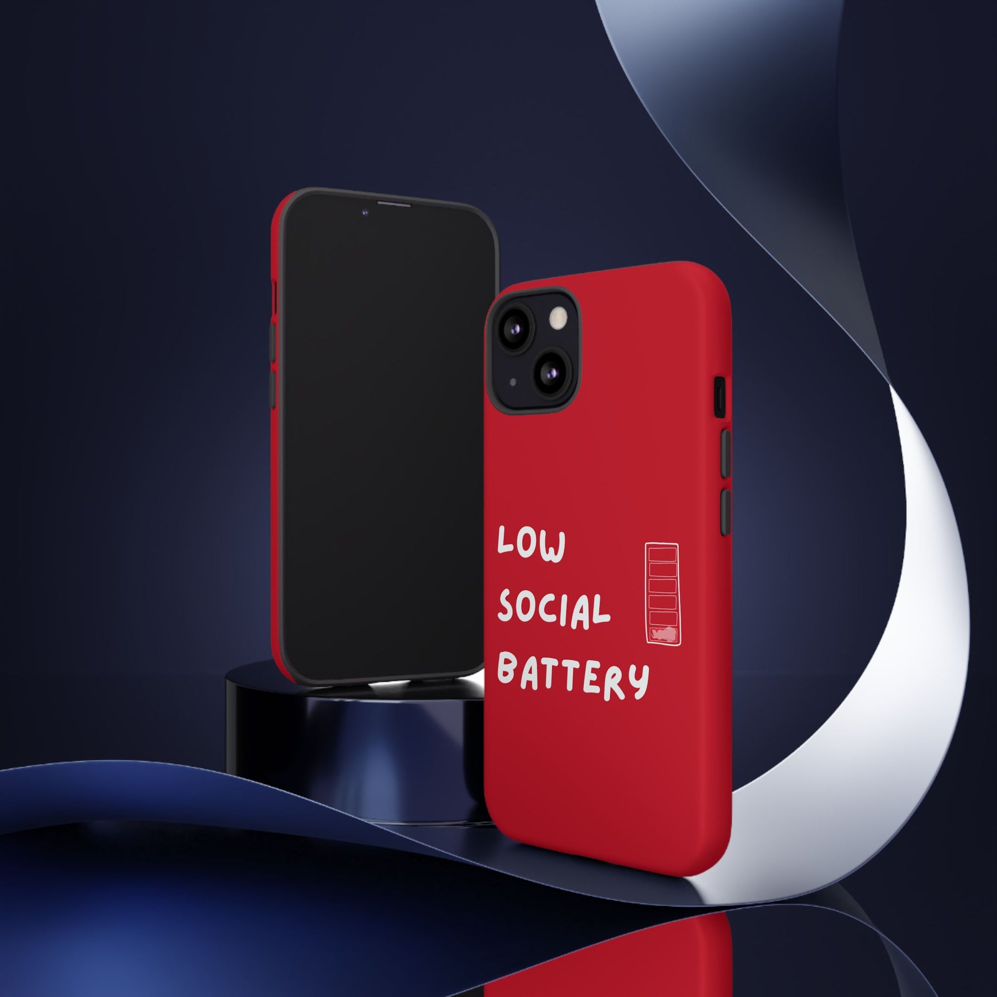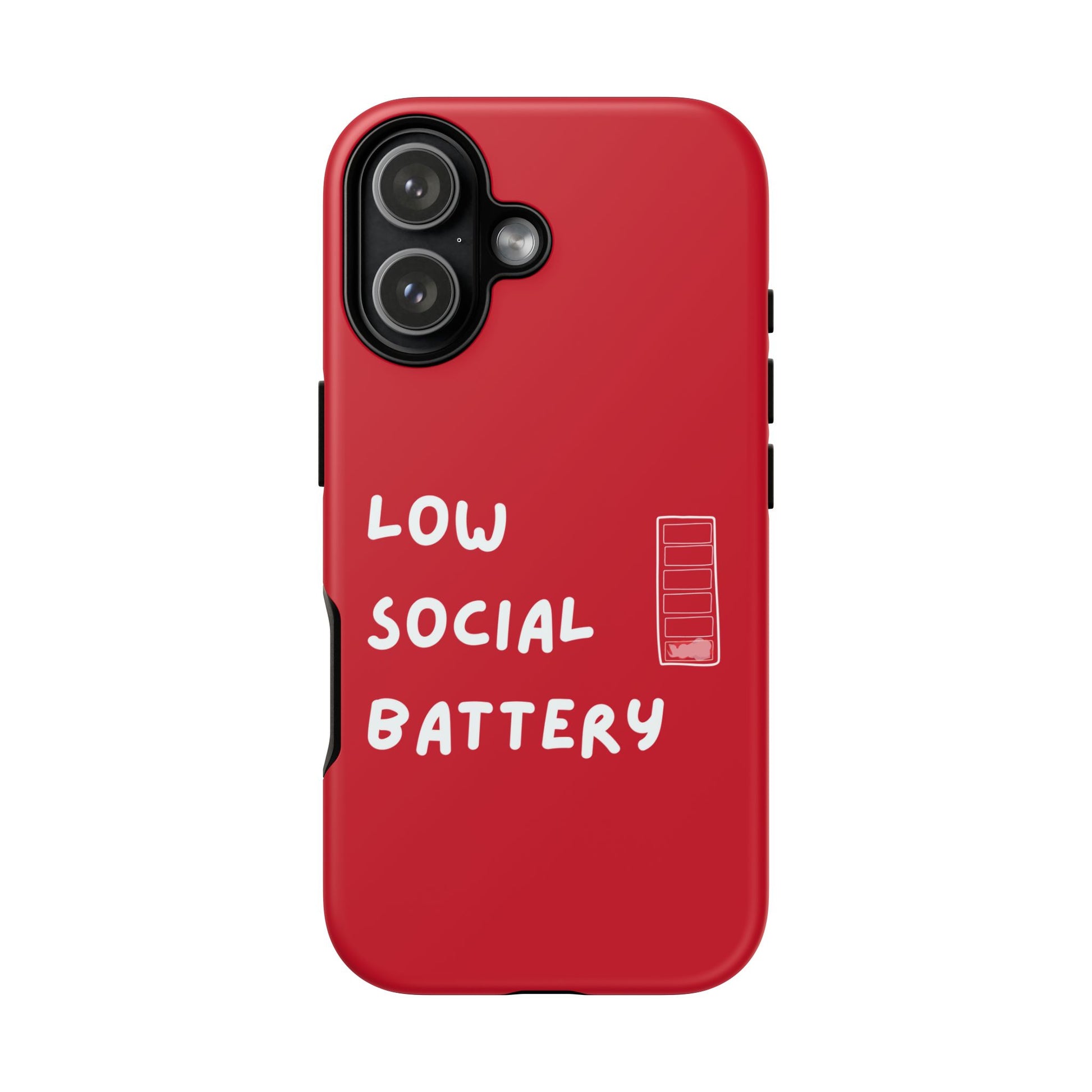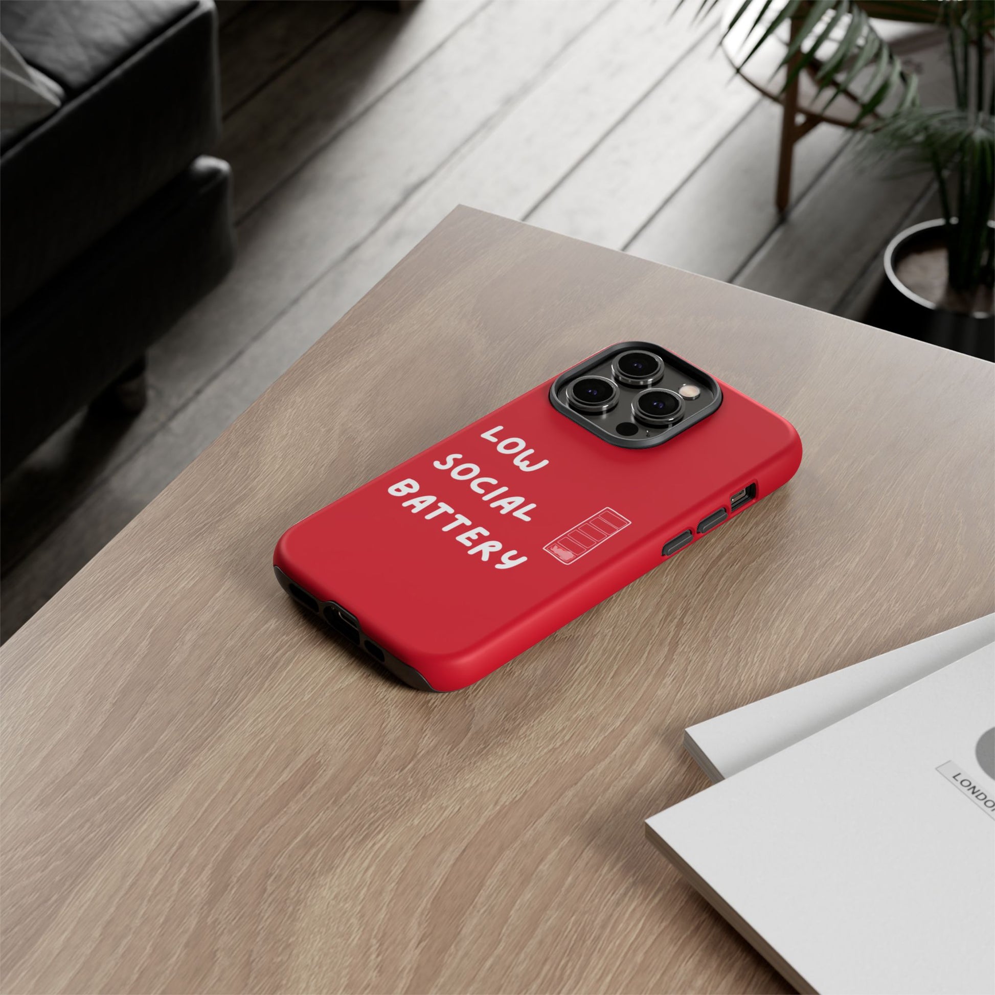 A slim, protective phone case with a playful, hand-drawn message: “Low Social Battery” next to a simple battery sketch. The bold red background and white handwritten-style lettering give it a youthful, offbeat vibe that announces mood with a wink. Built as a dual-layer shell (polycarbonate outer, TPU silicone liner) it balances impact resistance and everyday shock absorption while keeping ports accessible and wireless charging compatible. The case comes in glossy or matte finishes, features a full 3D wrap print with UV protection for long-term color retention, and meets strict safety and material certifications. Lightweight and confident, it’s for someone who values both personality and practical protection for their device.
